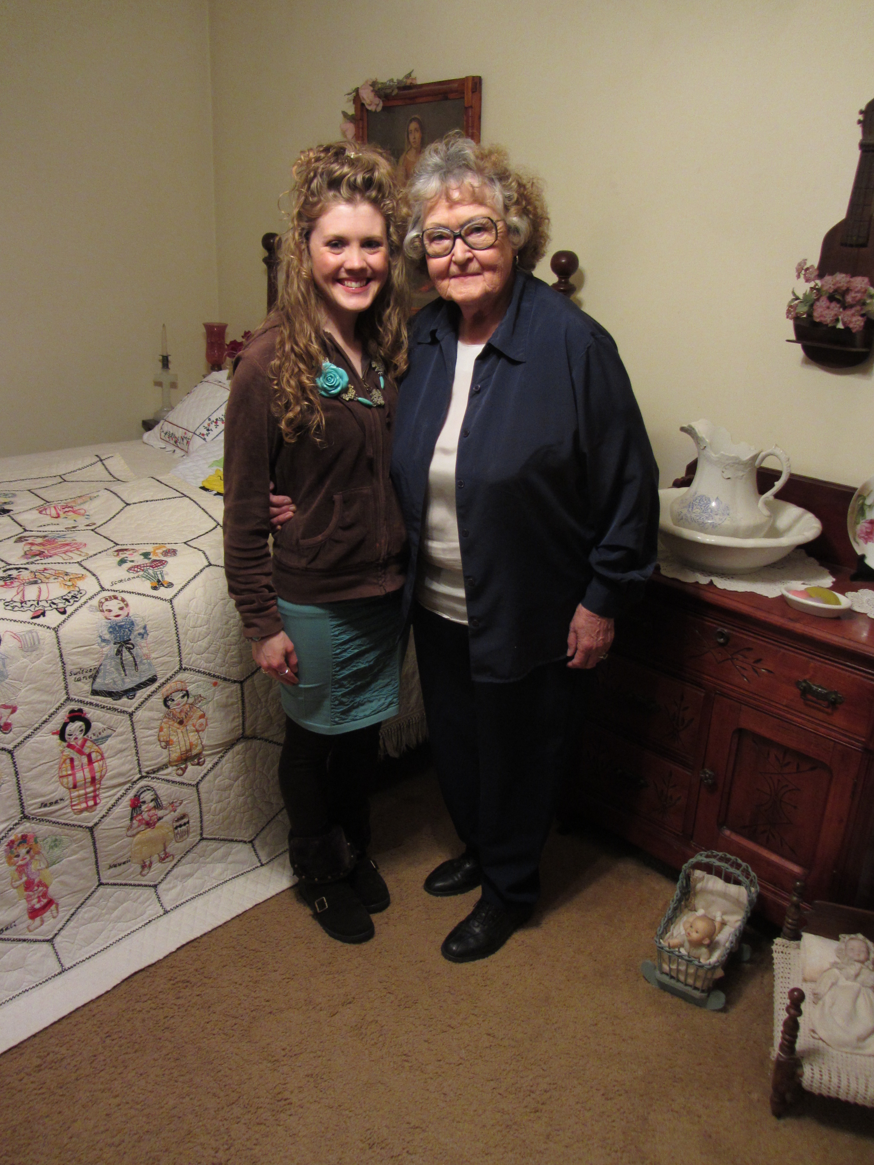 I celebrated by 25th birthday with my family, boyfriend and Great Aunt Delena (Dee). Stepping through her front door is like traveling through history. Her house is a museum of historical antiques and a gallery of artwork through her talented sewing. Her kitchen is like a cafe in Paris, the perfect place to indulge in birthday cake. She does not hesitate to share her stories. I took the time to interview her about her experience as a you farm girl in Kentucky then as a women in Indiana. She is one of my roles models and I hope you will find her stories and talents just as pleasant as I do!